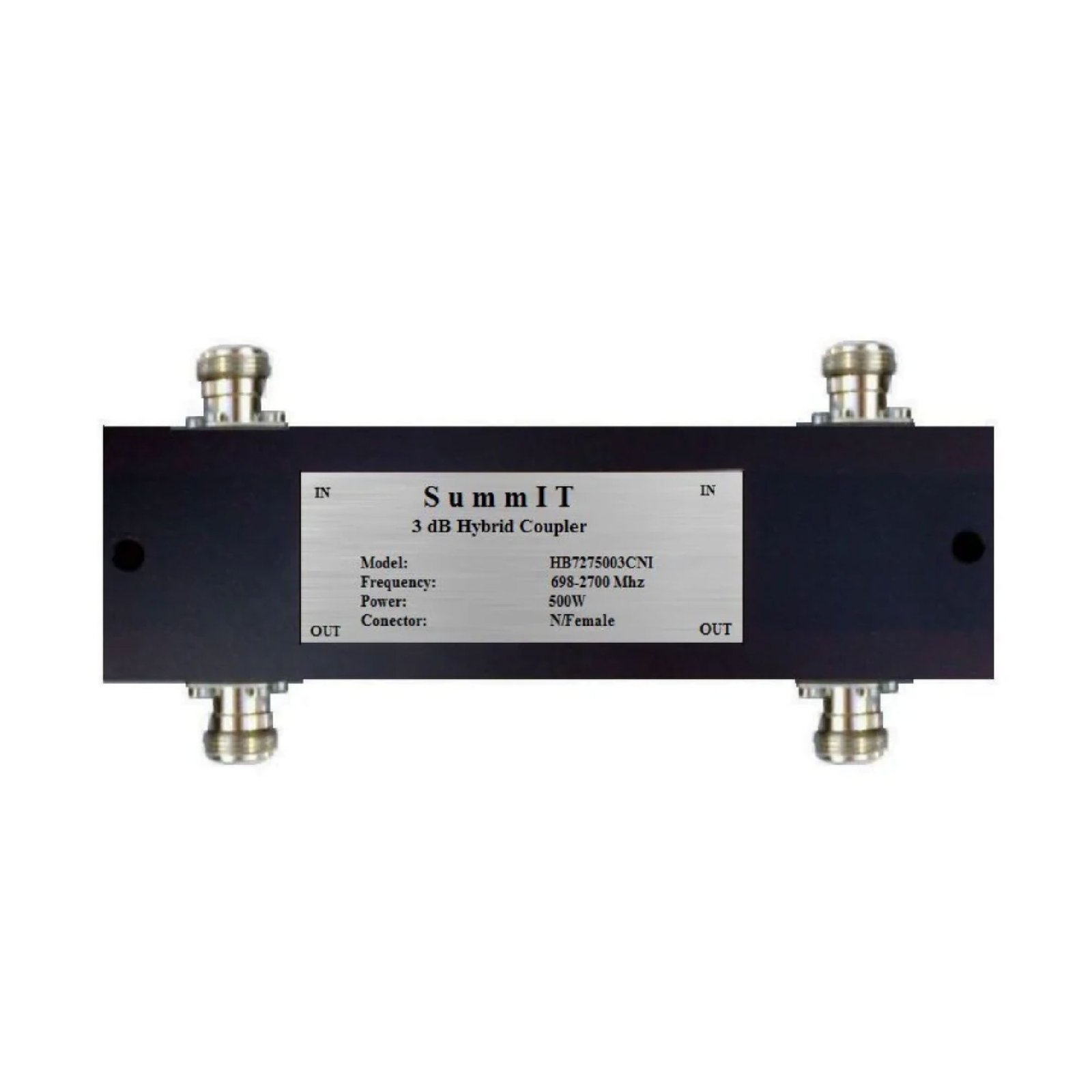 Acoplador híbrido SummIT, ideal para su uso como duplexor para sistemas de cabecera DAS o amplificadores combinados para compartir antenas aplicaciones con alto aislamiento. Estas unidades están equipadas con conectores 7/16 DIN-Hembra o N-Hembra y un resistente aluminio carcasa recubierta con un acabado de iridita transparente para un rendimiento confiable y duradero. Con Low PIM utilizado para redes LTE.