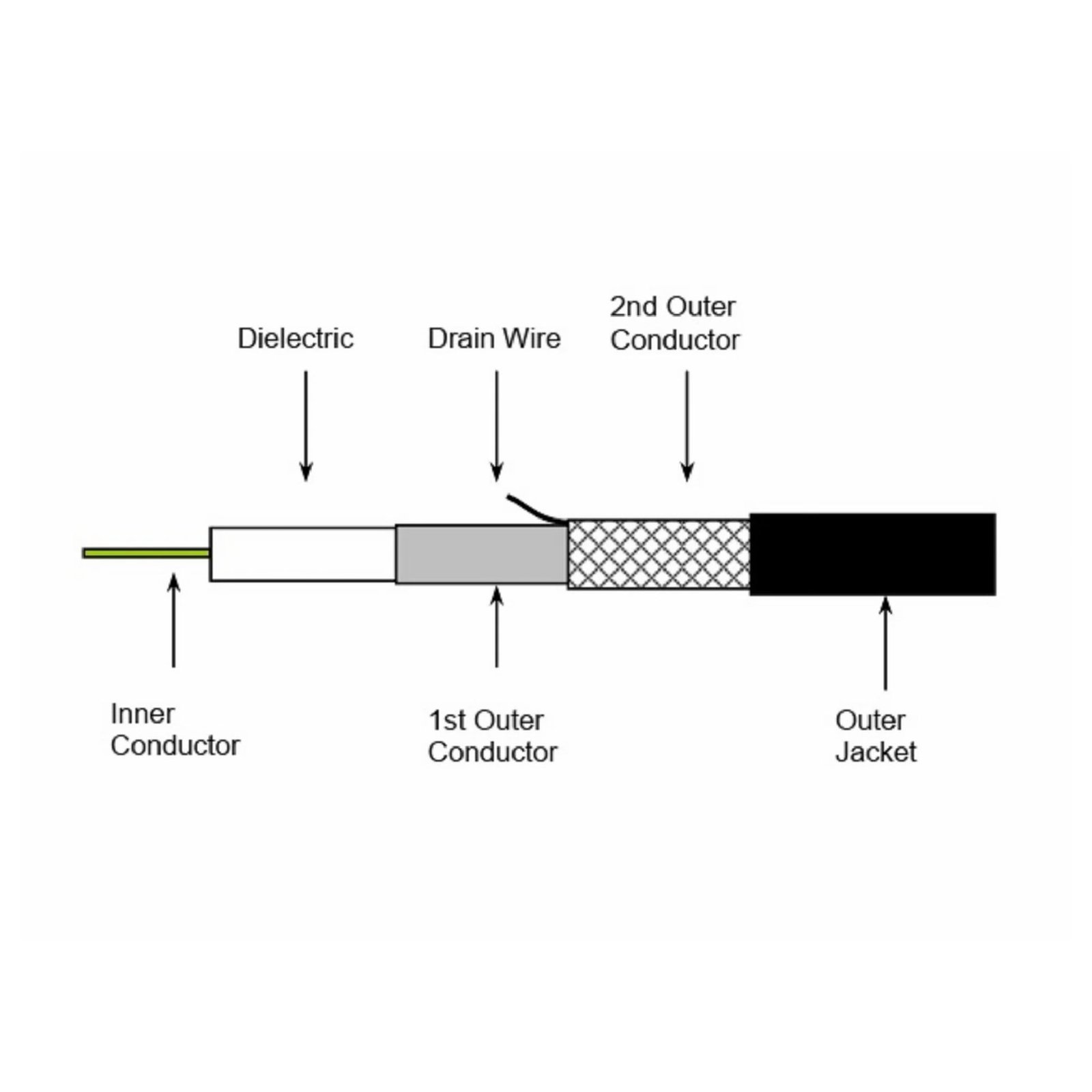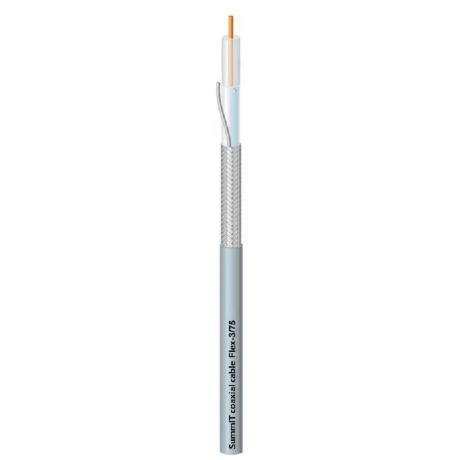 Cable Coaxial Flex 3/75, utilizado para transportar señales eléctricas de alta frecuencia que posee dos conductores concéntricos, uno de ellos siendo el conductor central encargado de llevar la información y el otro el externo tipo malla o trenza que sirve como referencia de tierra y retorno de las corrientes.