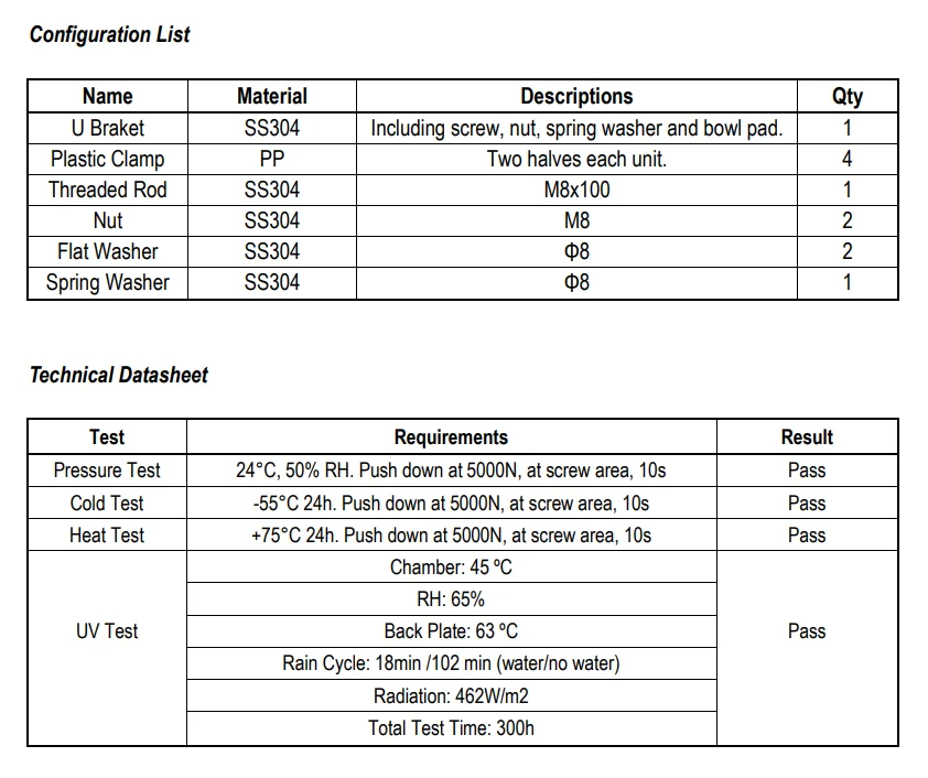 Las partes metálicas de la abrazadera de cable están hechas de acero inoxidable y las partes de plástico están hechas de polipropileno mejorado (PP). El PP mejorado es para mejorar las propiedades de retardo de llama, resistencia al calor, resistencia a la temperatura, estabilidad dimensional y rigidez.