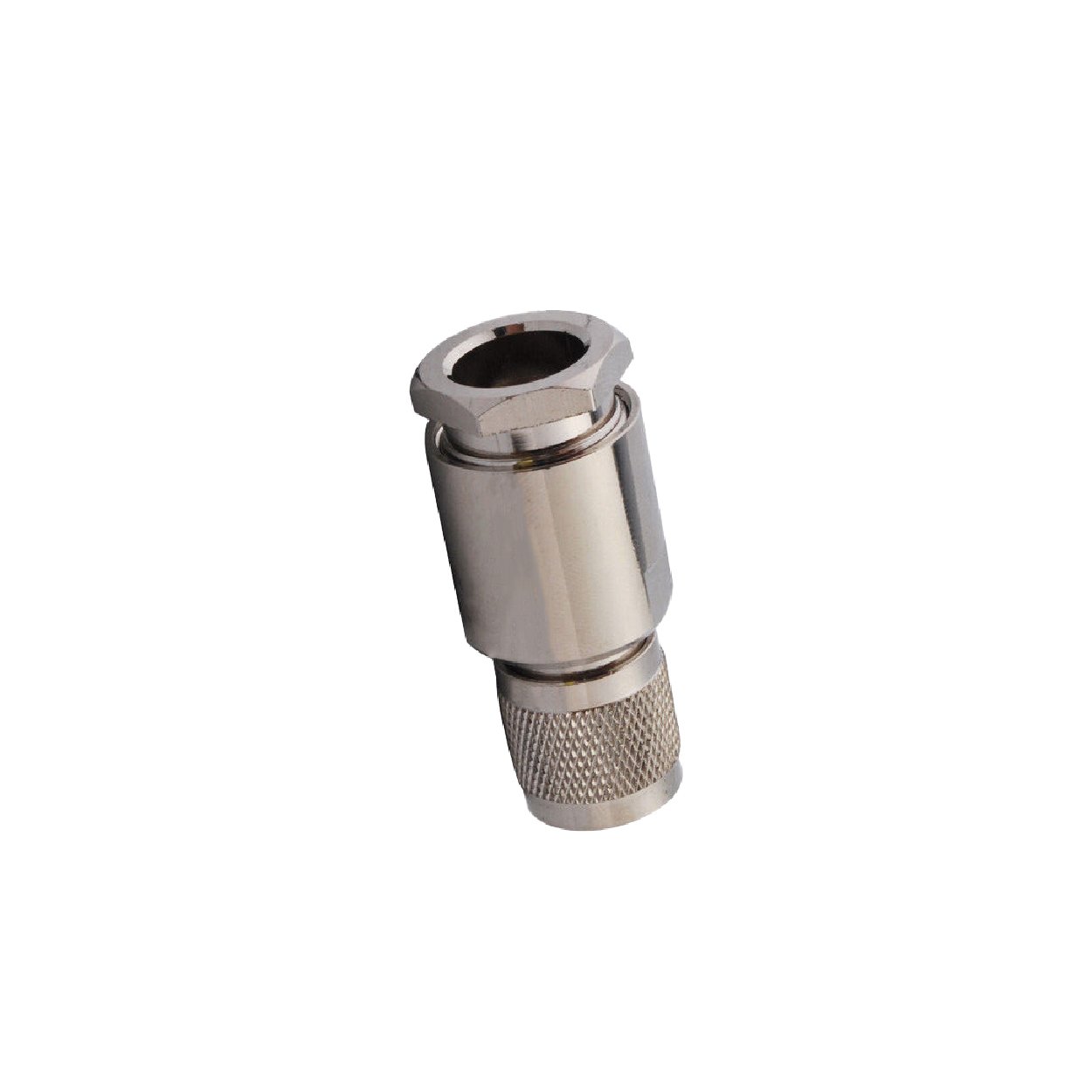 Conector macho tipo N, diseñado para conectar cables coaxiales en equipos electrónicos.