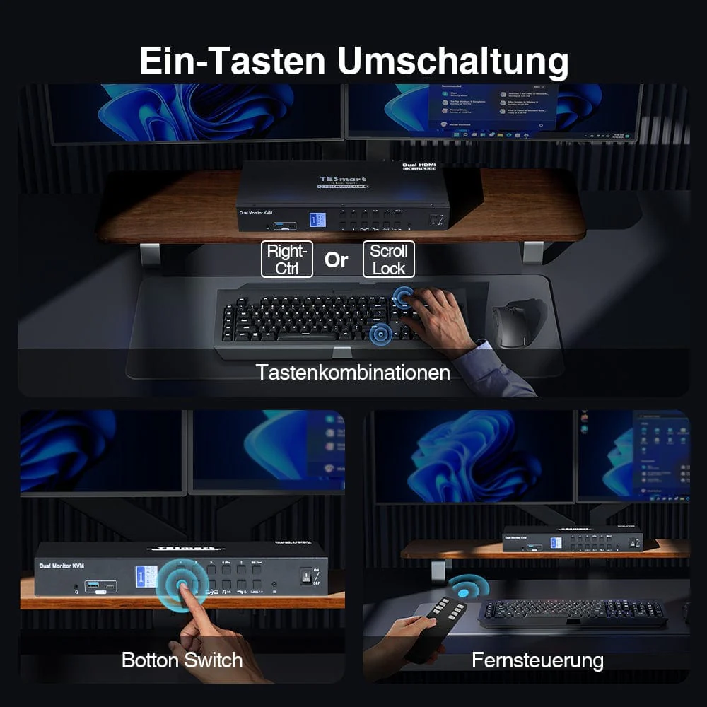 • Administre eficientemente 4 PC con un conjunto de teclado, mouse y pantallas triples 4K60Hz.