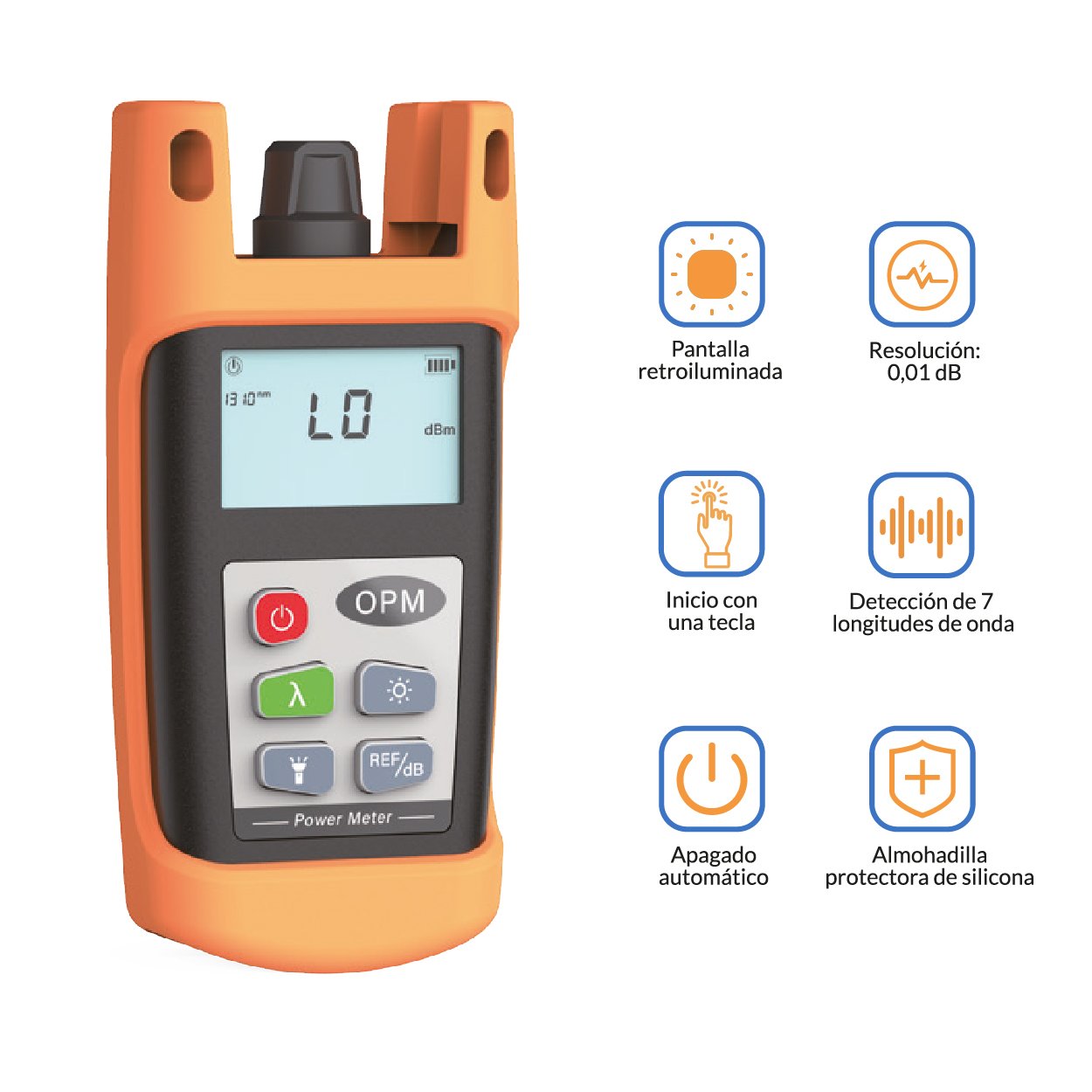Equipo medidor de potencia óptica de alta precisión, con diseño innovador, fácil de operar y fácil de transportar. Equipo multifuncional, ideal para mediciones en redes. Compatible con