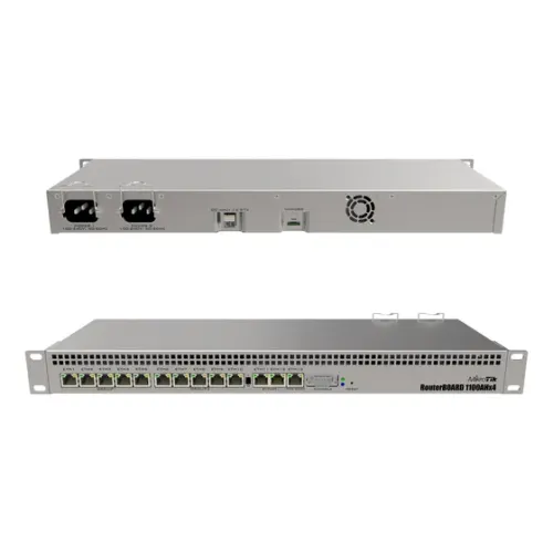 Presentamos el RB1100AHx4, el cual cuenta con 13 puertos Router Gigabit Ethernet, un CPU Annapurna Alpine AL21400 con cuatro núcleos Cortex A15 programados en 1.4GHz cada uno, para un rendimiento al máximo de hasta 7.5Gbps. El equipo soporta aceleración de hardware IPsec.